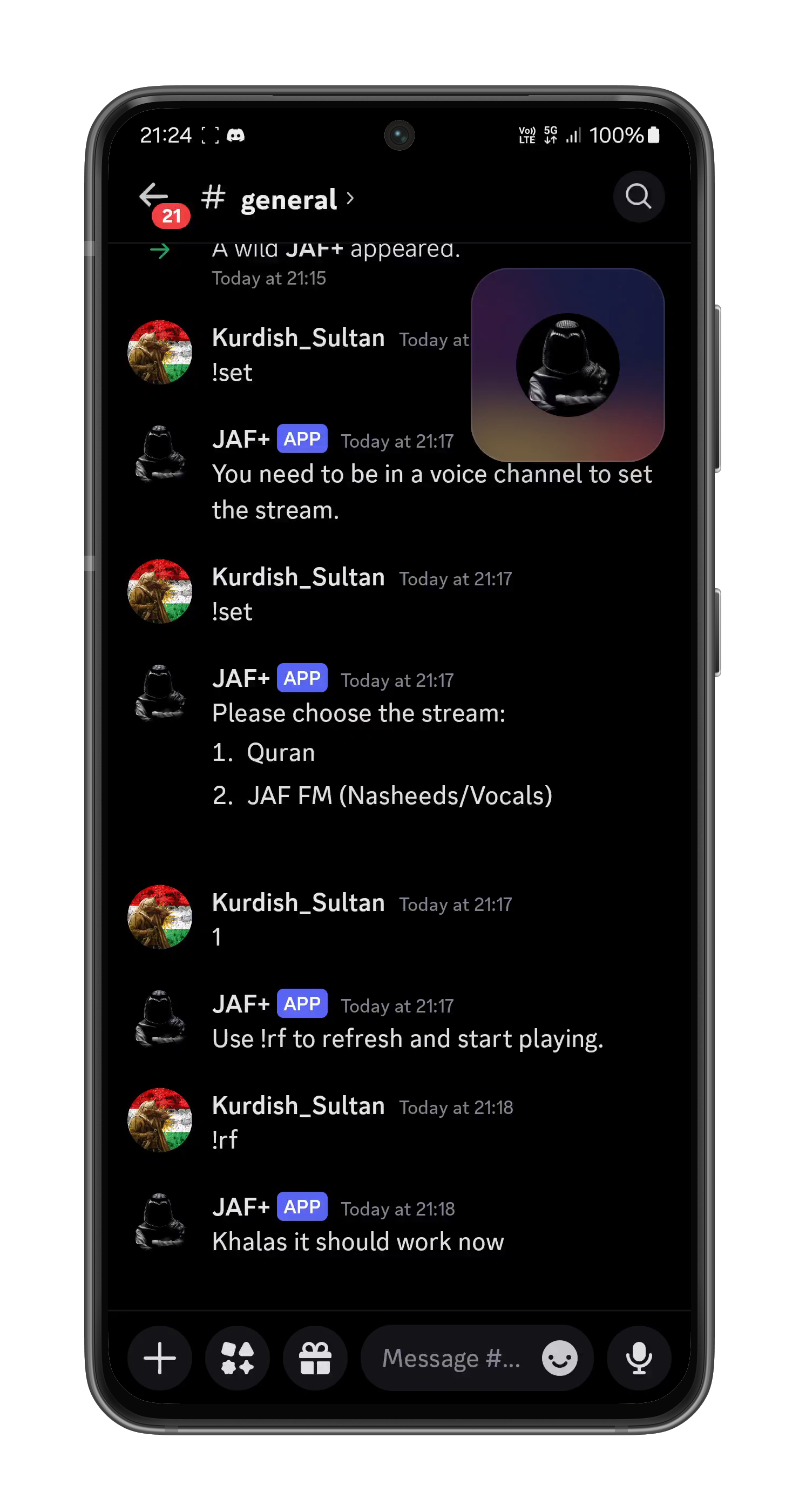 خدمتنا الشائعة في ديسكورد هي بوت يبث القرآن أو الأناشيد على مدار الساعة طوال أيام الأسبوع دون الحاجة إلى تفاعل المستخدم.